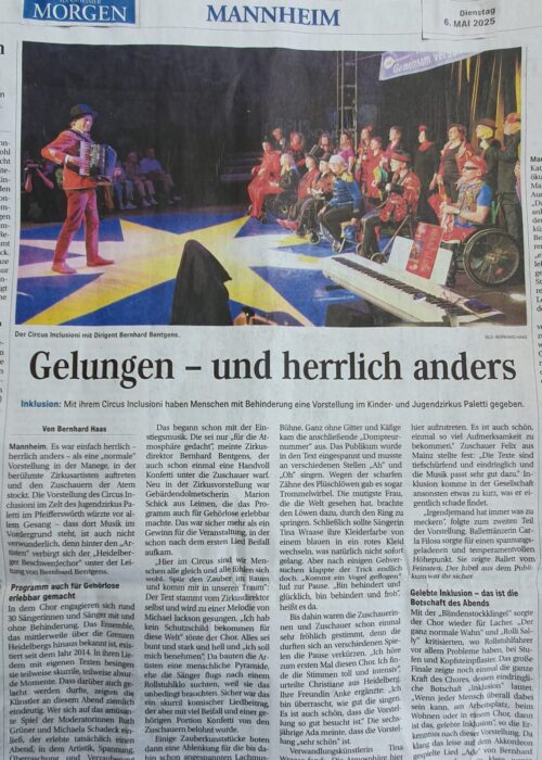 Heute findet die Aufführung des Heidelberger Beschwerdechors „Circus Inclusioni” im Zelt des Kinder- und Jugendzirkus Paletti in Mannheim statt. Für mich ist es die erste Zirkusaufführung, für den Chor bereits die dritte. Nach dem plötzlichen Tod meines Vaters im Oktober 2023 konnte ich nicht mehr mitsingen. Erst nachdem ich meine Burnout-Behandlung in der Tagesklinik im März fast abgeschlossen hatte, stieg ich wieder langsam in die Chorproben ein.