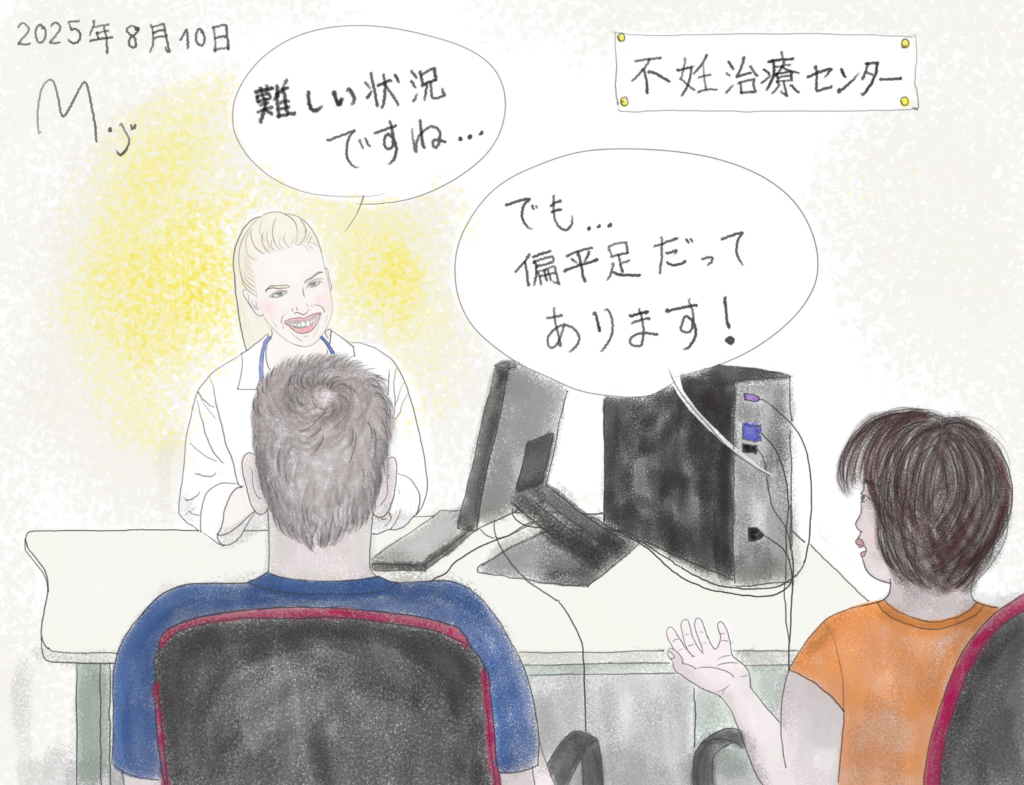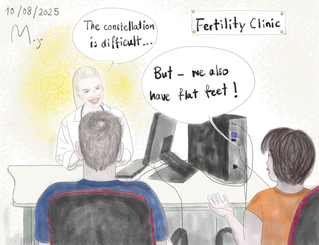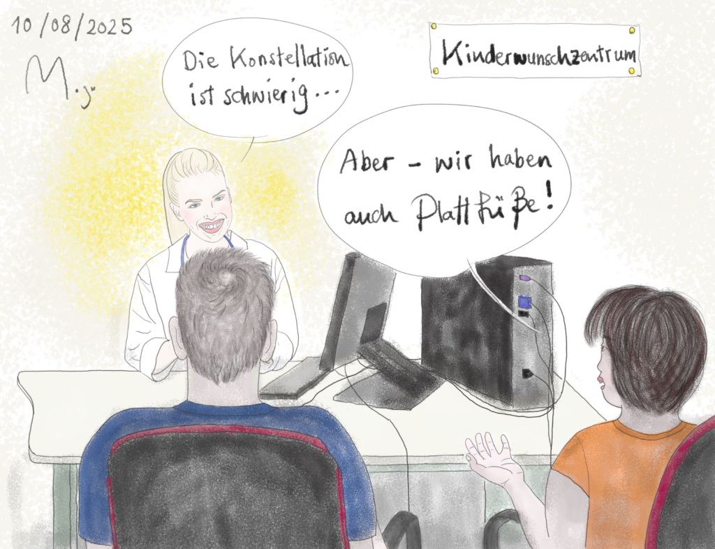 Nach Jahren sorgfältiger Abwägung der Vor- und Nachteile einer Behandlung kamen wir zum Beratungsgespräch. Gleich zu Beginn entschied die junge Ärztin, nachdem sie unsere Diagnosen gehört hatte, dass eine Behandlung nicht möglich sei. Sie schloss mit den Worten: „Die Konstellation ist sehr schwierig.“ Auf dem Heimweg sagte mein Mann: „Wir hätten ihr sagen sollen, dass wir auch Plattfüße haben!“